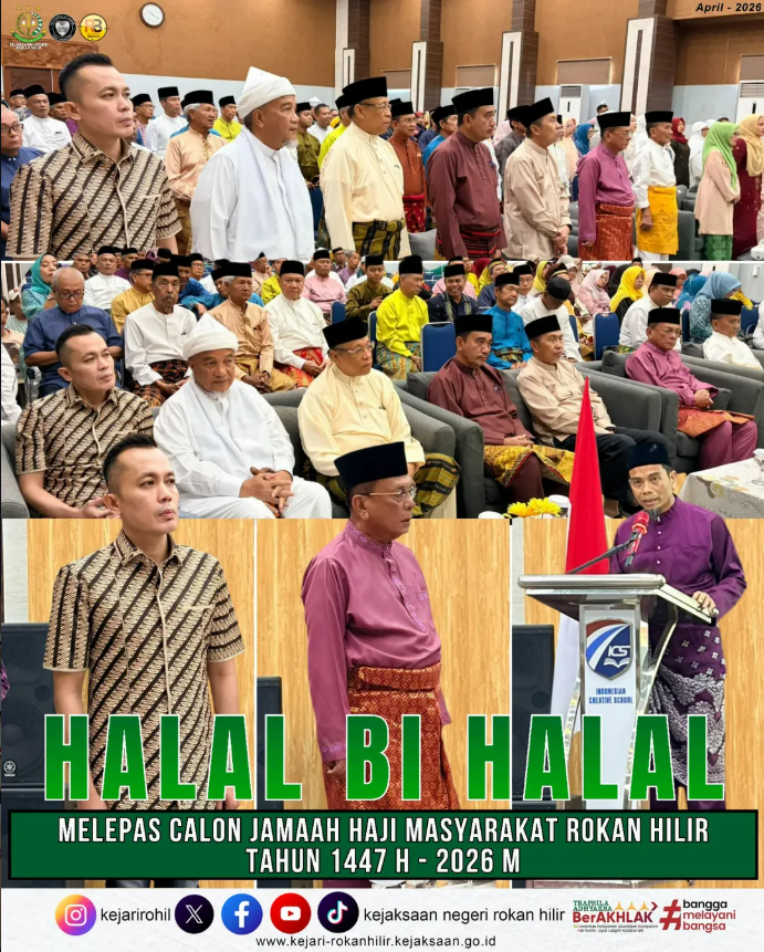 Minggu, 19 April 2026, telah dilaksanakan kegiatan Halal Bi Halal sekaligus Pelepasan Calon Jamaah Haji Masyarakat Kabupaten Rokan Hilir Tahun 1447 H / 2026 M yang bertempat di Creativity Hall Indonesia Creative School, Lantai 2, Jl. Melati No. 11, Kelurahan Sidomulyo Timur, Kecamatan Marpoyan Damai, Pekanbaru.