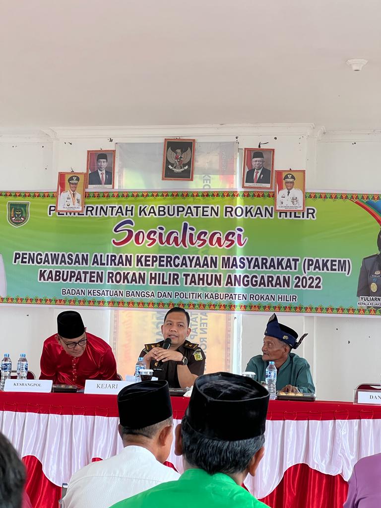 Sebagai Narasumber Kasi Intelijen Kejari Rohil Yogi Hendra.SH.MH menyampaikan bahwa berdasarkan UU Kejaksaan di bidang Intelijen dalam bidang ketertiban dan ketentraman umum Kejaksaan turut menyelenggarakan kegiatan pengawasan aliran kepercayaan yang dapat membahayakan masyarakat dan Negara serta melakukan pencegahan penyalahgunaan dan/atau penodaan agama. Sehingga dibentuklah Tim Koordinasi Pakem berdasarkan Peraturan Jaksa Agung Nomor 5 Tahun 2019 tentang Perubahan Jaksa Agung Nomor : PER-019/A/JA/09/2015 tentang Tim Koordinasi Pengawasan Aliran Kepercayaan dan Aliran Keagamaan dalam Masyarakat dan keputusan Jaksa Agung Republik Indonesia Nomor 243/A/JA/08/2019 tanggal 12 Agustus 2019 tentang Pembentukan Tim Koordinasi Pengawasan Aliran Kepercayaan dan Aliran Keagamaan dalam Masyarakat tingkat Pusat.