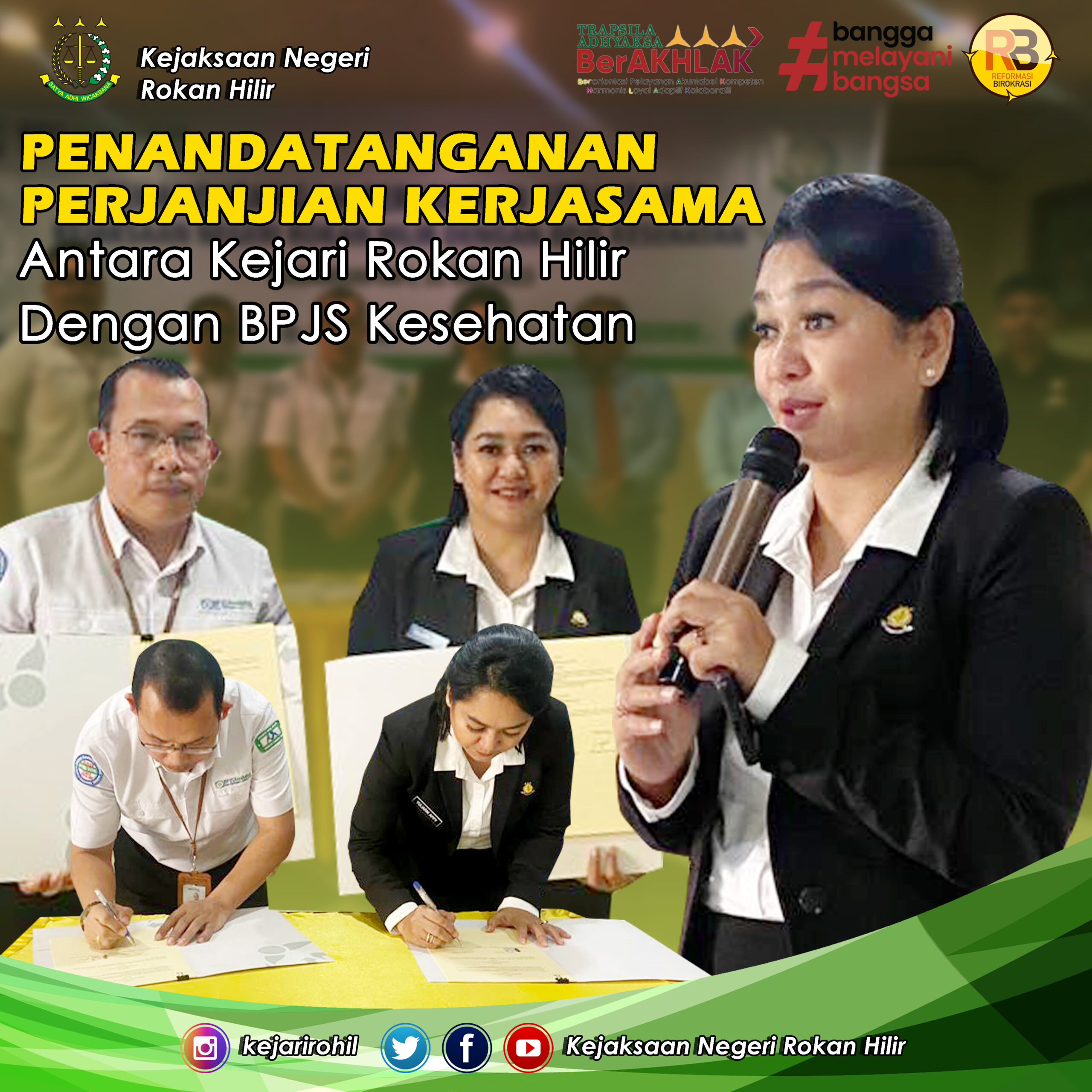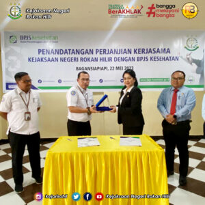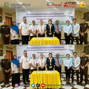 Kepala Kejaksaan Negeri Rokan Hilir Ibu Yuliarni Appy.,S.H.,M.H didampingi Kasi Datun Kejari Rokan Hilir Bapak Irvan Rahmadani Prayogo,S.H.,M.H beserta Kasubsi Datun ibu Tiara Robena Panjaitan, S.H, Jaksa Fungsional dan Staf pada Seksi Datun melakukan Penandatangan Perjanjian Kerjasama Kejaksaan Negeri Rokan Hilir dengan Badan Penyelenggaran Jaminan Sosial (BPJS) Kesehatan bertempat di Aula Hotel Lion Bagansiapiapi Kab. Rokan Hilir