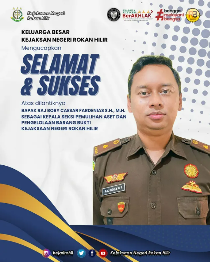 Keluarga Besar Kejaksaan Negeri Rokan Hilir mengucapkan selamat datang dan selamat bertugas kepada Kepala Seksi Pemulihan Aset dan Pengelolaan Barang Bukti Bapak Raj Boby Caesar Fardenias, S.H., M.H.