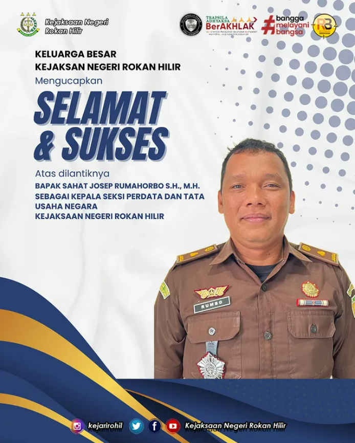 Keluarga Besar Kejaksaan Negeri Rokan Hilir mengucapkan selamat datang dan selamat bertugas kepada Kepala Seksi Perdata dan Tata Usaha Negara Bapak Sahat Josep Rumahorbo, S.H., M.H.