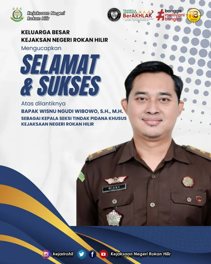 Keluarga Besar Kejaksaan Negeri Rokan Hilir mengucapkan selamat datang dan selamat bertugas kepada Kepala Seksi Tindak Pidana Khusus Bapak Wisnu Ngudi Wibowo, S.H., M.H.