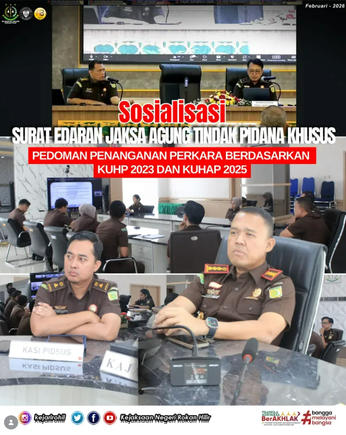 Pada hari Senin, 2 Maret 2026, Kepala Kejaksaan Negeri Rokan Hilir, Firdaus, bersama Kepala Seksi Tindak Pidana Khusus Wisnu Ngudi Wibowo, mengikuti kegiatan sosialisasi Surat Edaran Jaksa Agung Tindak Pidana Khusus tentang Pedoman Penanganan Perkara berdasarkan KUHP 2023 dan KUHAP 2025.